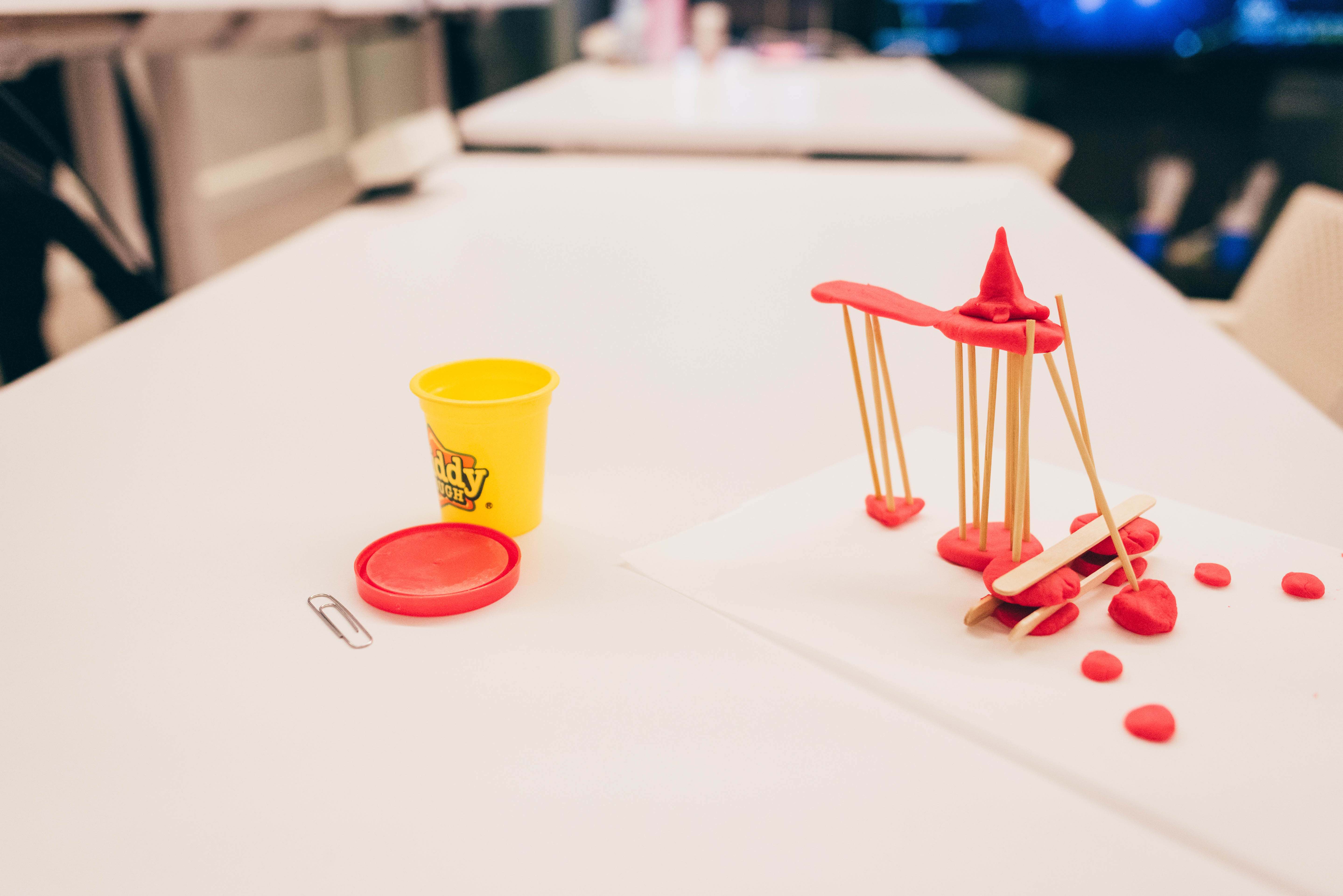 They began with loose sketching and bringing ideas from pen to paper. And then, just as we do when designing a digital experience, we quickly tested an interaction or part of a workflow with a quick prototype. In this case, participants were free to play with Play-Doh, pipe cleaners and popsicle sticks to create prototype models of their sketches.
